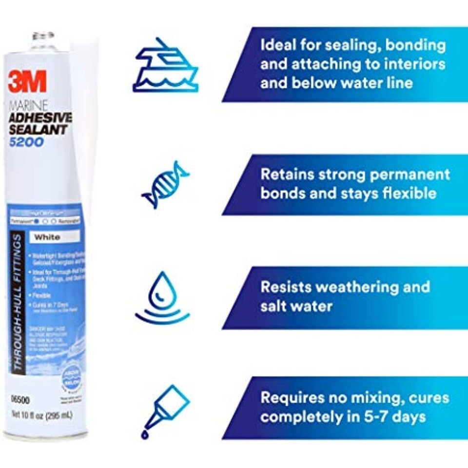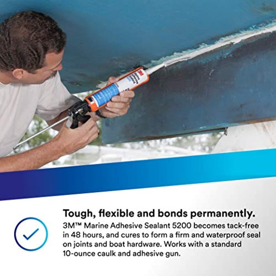 3M Marine Adhesive Sealant 5200 is a tough, flexible polyurethane for permanent bonding and sealing your RV, boat or other watercraft. It is ideal for use on wood, gelcoat, fiberglass, metal and more. It is recommended for interiors, below the waterline and any other places that are shielded from sunlight. It applies right from the container ? no mixing is required. It becomes tack-free in 48 hours, and cures to form a firm, flexible, waterproof seal on joints and boat hardware. Far more than a marine caulk, tough, flexible Marine Adhesive 5200 dissipates stress caused by vibration and shock, and won?t crack under dynamic force. It resists saltwater, wind, weather and temperature extremes for long periods of worry-free enjoyment on the water. In fact, for more than 50 years, 3M Marine Adhesive Sealant 5200 has been used and trusted as a marine sealant by professionals in some of the most demanding conditions on earth.