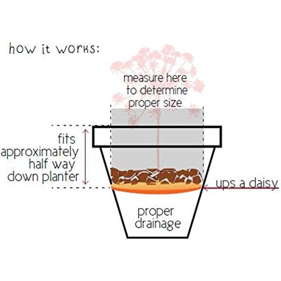 The Up?s A Daisy gives your plants a lift! This planter insert that will save you time and money by helping you use less potting soil, reducing the planter weight, and helping you prevent root rot. No messy fillers needed with this reusable, and washable option. The Up?s A Daisy is made of sturdy and recyclable plastic and can hold the weight of several bags of soil.