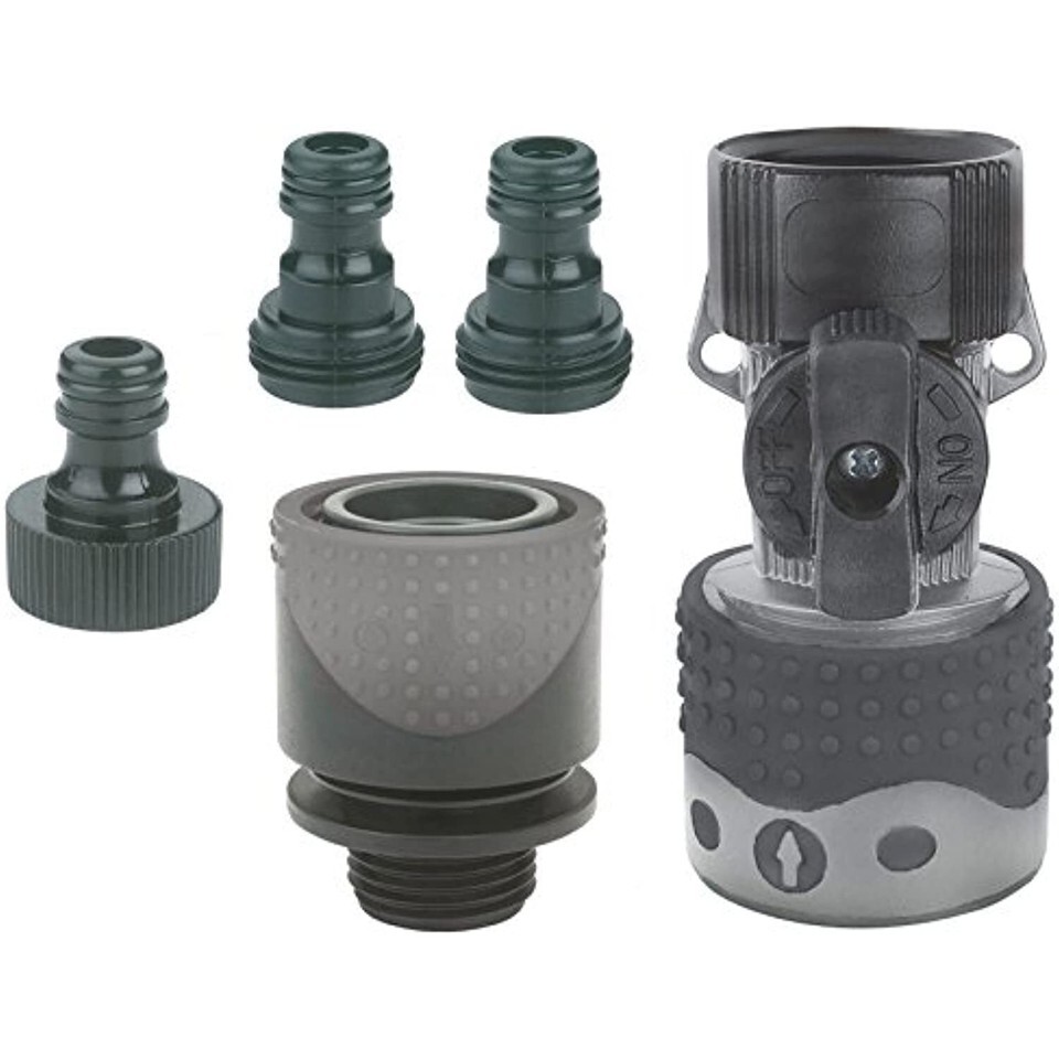 Provides quick and easy connections to faucet, hose, and hose end accessories; Eliminates time consuming on/off threading; Includes 1 female hose end connector with water shut-off valve, 2 male hose end adapters, 1 female faucet adapter, and 1 male faucet adapter.