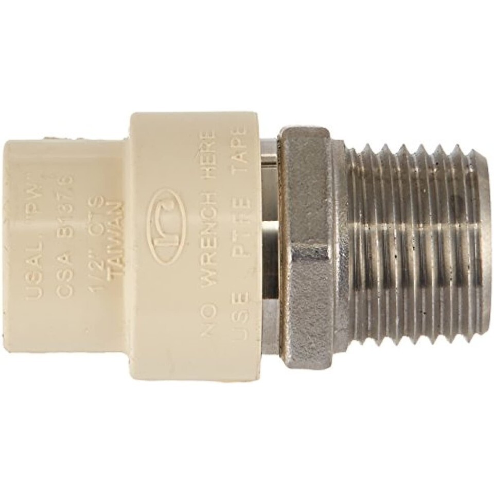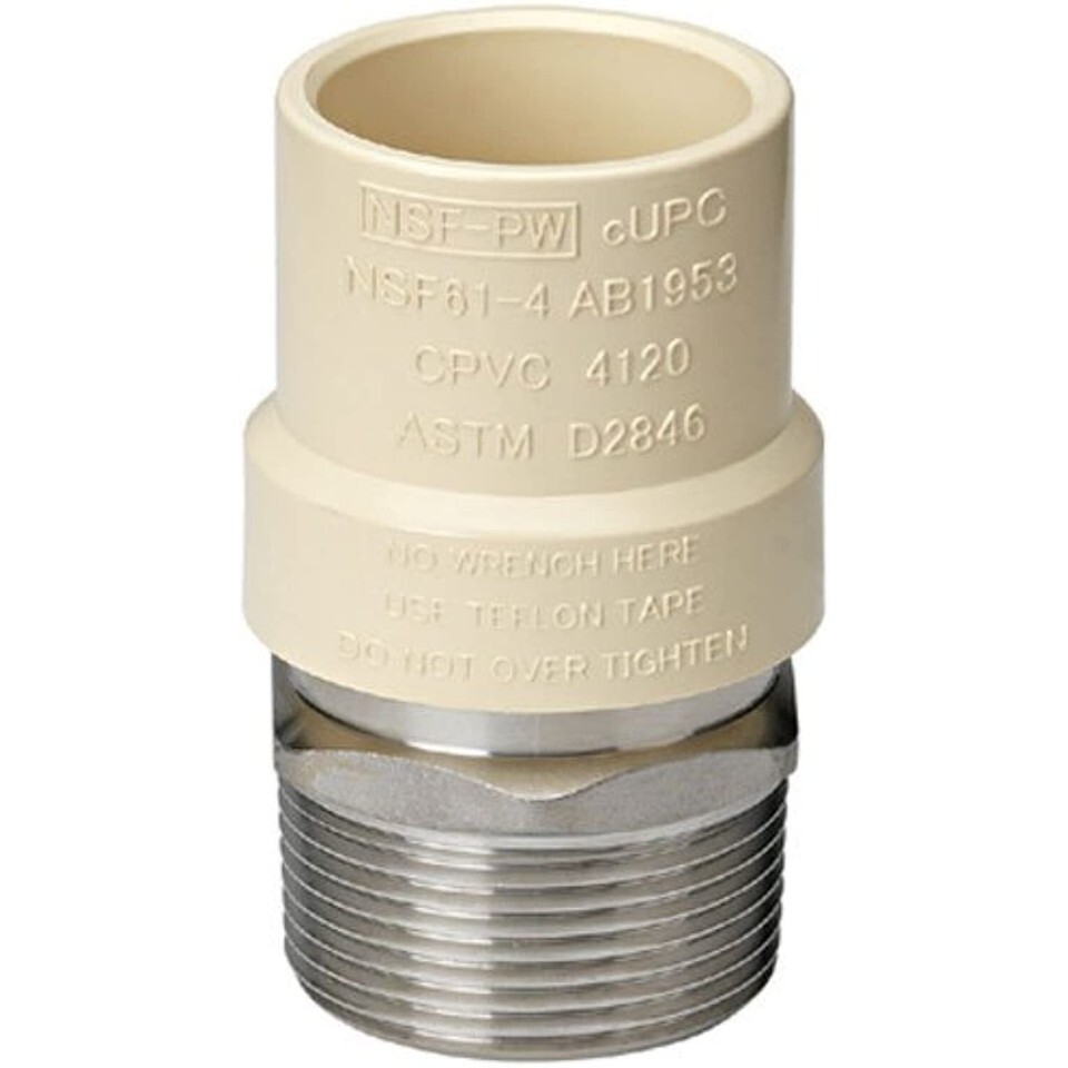 1/2 inch male iron pipe threaded, stainless steel x cpvc transition Adapter, meets California AB1953 no lead requirement.