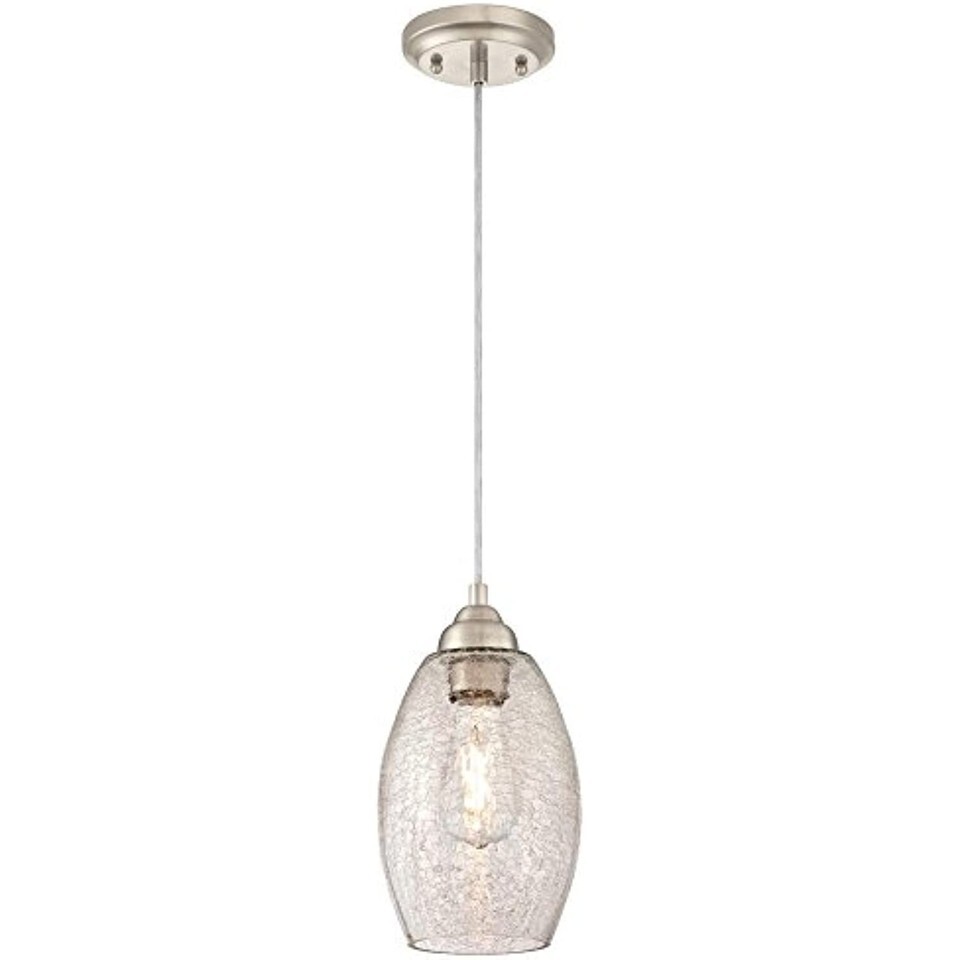 The Westinghouse one-light brushed nickel indoor mini pendant makes a stunning impression. The soft brushed nickel finish is elegant, while the hand blown clear crackle glass adds sparkling illumination to any decor. Hang in your entryway for welcoming ambiance, in the dining room as distinctive focal point, or in the kitchen for task lighting. Westinghouse is a trusted, global brand. Westinghouse knows lighting and offers products with exceptional quality, reliability and functionality.Recommended Light Bulb Shape Code:A19. Product reference number 61057.