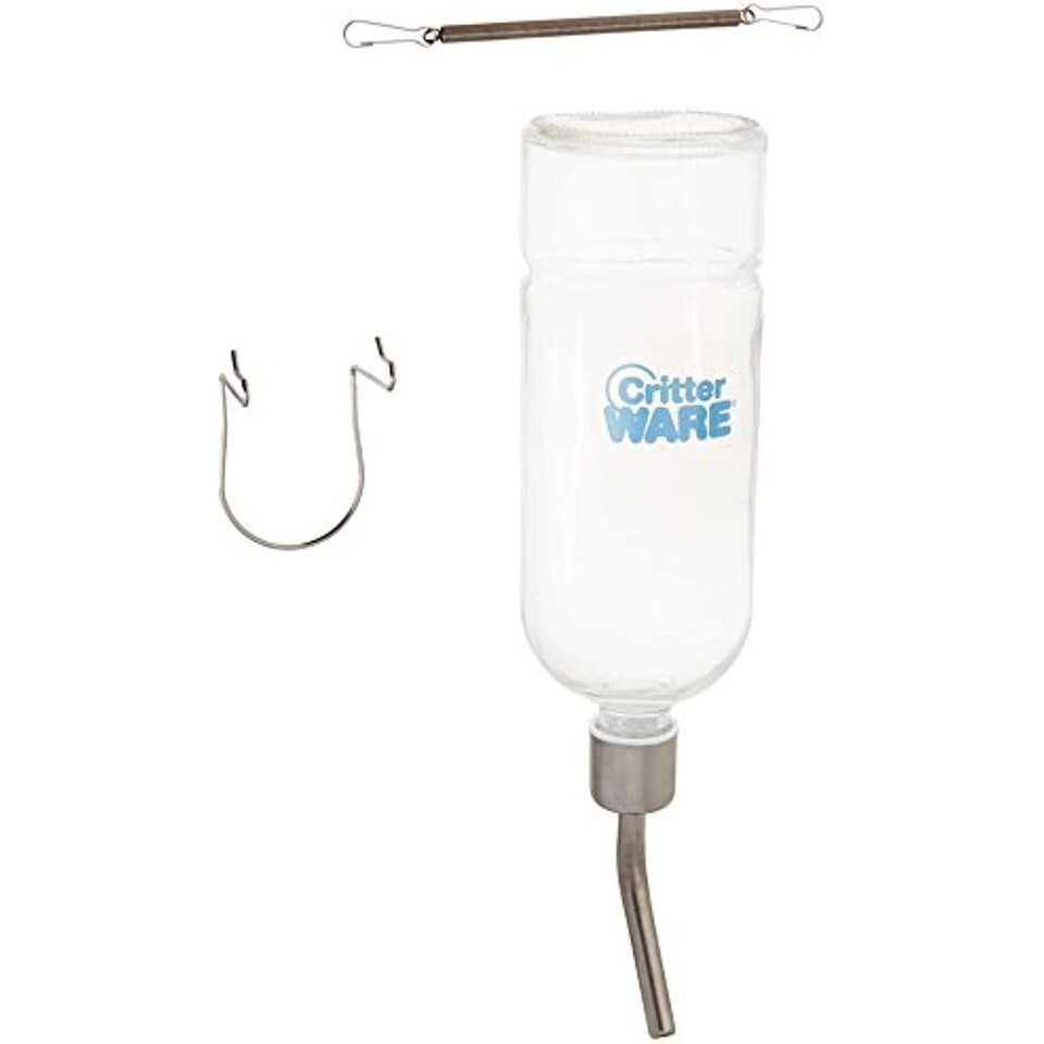 Critter Carafe is a premium quality glass bottle with a chew-proof design and drip resistant sipper. Simple, secure tension spring and steel support can be used inside or outside a cage. Includes a floating water level indicator. Design for rabbits, ferrets, chinchillas, guinea pigs, and other small animals. Size: 26 ounce Dishwasher safe Quality chew-proof glass Floating water level indicator Drip resistant Design for rabbits, ferrets, chinchillas, guinea pigs, and other small animals Measures 3.4" width by 3.25" depth by 12.75" height. Note: Fill completely with cool water and replace cap securely. A few initial drops are normal while the vacuum forms.
