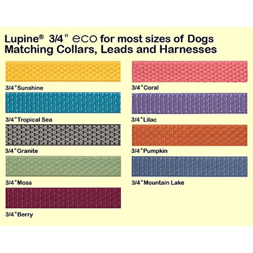 Eco by Lupine products are proudly built in Conway, New Hampshire and Guaranteed (Even if Chewed). Made from recycled plastic bottles. Bottles are melted, purified and extruded into thread. The thread is then woven to create this unique soft yet strong material with a rich texture. 3/4" wide harnesses are suitable for a widest range of dogs. Features strong bar-tack stitching, welded D-rings and a custom designed side-release buckle. In 9 designer colors with matching leashes and collars available. To determine harness size, measure snugly around the dog, just behind the front legs, then add an extra 5-percent for a comfortable fit. Machine wash, warm water, mild soap (no bleach or bleach alternative). Air dry. Lupine products are not recommended for tie-out.