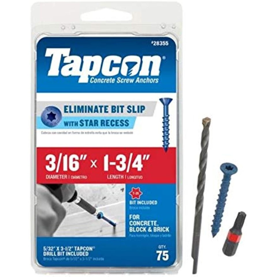 As the original concrete screw anchor that revolutionized the construction world, Tapcon brand concrete anchors deliver the ease of use, superior precision and the unparalleled performance that professionals demand. With a new star recess to eliminate bit slip, Tapcon drives with ease and the patented thread design allows for quick and successful installation no matter the type masonry substrate anchored into. Use Tapcon concrete screw anchors for wood framing to concrete, electrical equipment, furring strips and many other applications that require fastening into brick, block or concrete.