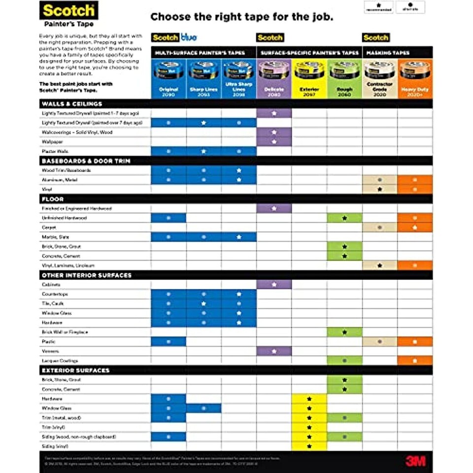 ScotchBlue Original Painter's Tape is the tape that DIY painter's and pros have loved for more than 30 years. Whether you're protecting your wood trim, painted walls, tile floor, or glass windows, this versatile multi-surface tape can stay on surfaces for up to 14 days and then removes easily without leaving any sticky residue behind. Help protect your surfaces while bringing your creative vision to life with the help of ScotchBlue Original Painter's Tape.