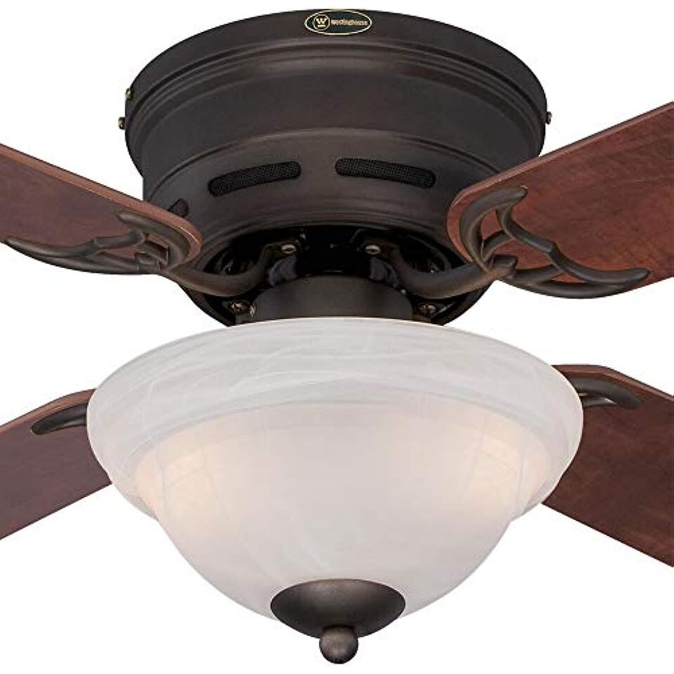 Add traditional style and year-round comfort to your home with the Hadley 42 inch ceiling fan with light. The Hadley flush mount ceiling fan is designed specifically for small to medium sized rooms with low ceilings. The rich oil rubbed bronze finish and beautiful white alabaster glass bowl create an elegant look. Reversible blades in complementary finishes of applewood or cherry give you options to match your room's decor. The ceiling fan light kit with LED and white alabaster glass adds energy-efficient illumination and charm. Product reference number 72305.