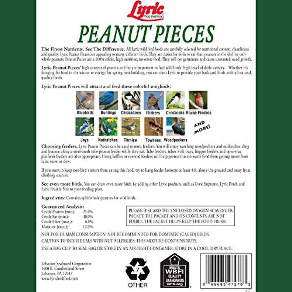 Lyric Peanut Pieces are a perfect treat for feathered friends visiting your backyard bird feeders. Lyric Peanut Pieces are a 100% edible, no-waste food that provides protein and fat nutrients for wild birds. Sure to attract chickadees, nuthatches, titmice, woodpeckers and more!