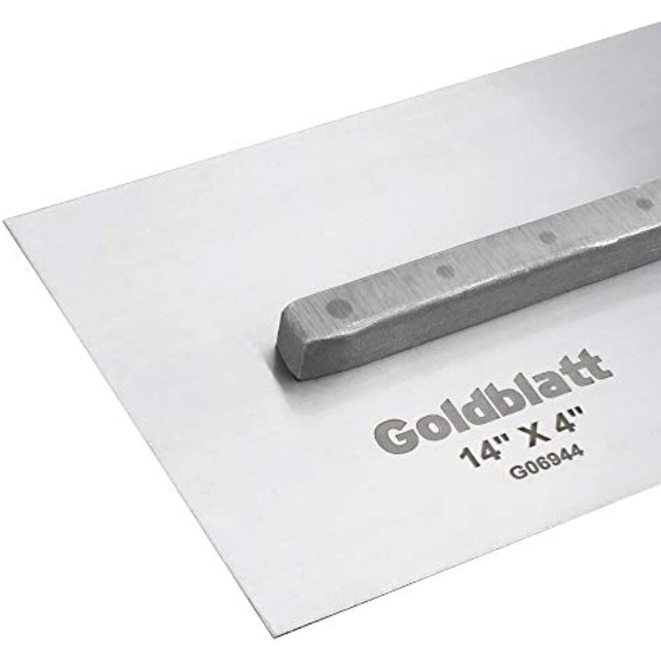 14", Flat Finishing Trowel With High Carbon Steel Blade, Cross Ground Edge Ground This Pre-Broken In Blade Is Ready For Use. The Goldblatt Pro-Grip series concrete finishing trowels are designed for the professional tradesman. The ergonomic Pro-Grip handle ensures a firm comfortable grip. Made of high carbon steel for durability, this trowel has a special cross-ground face and bevel ground edges to help you achieve the perfect hand finish. Constructed with a patent pending magnesium tang, these trowels are the lightest weight finishing trowels on the market. Available in a variety of lengths. Pro-Grip handle for comfort Precision crafted blade Light weight 14" x 4" Lifetime Warranty