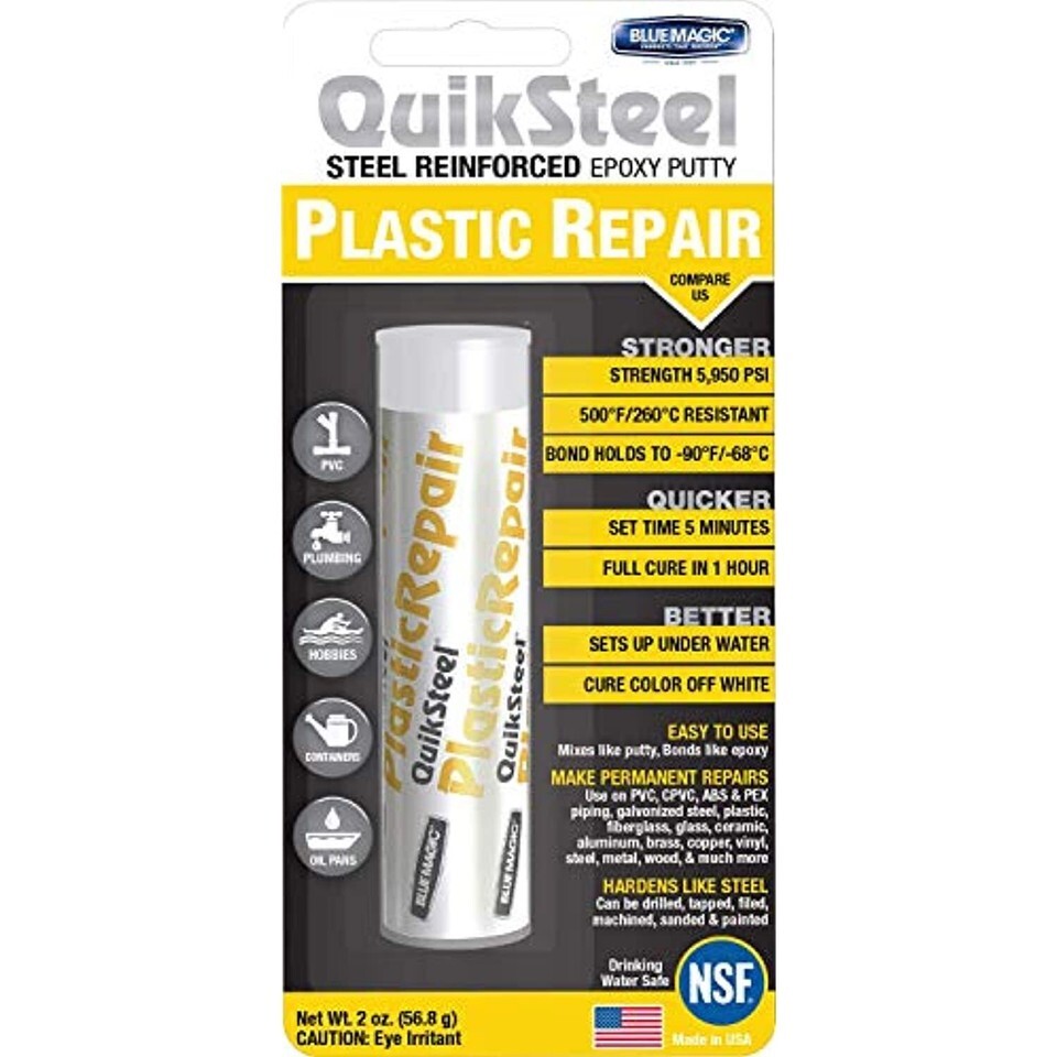 QuikSteel plastic repair white epoxy putty is temperature resistant to 500 degrees, sets in 5 minutes, bonds like epoxy, is NSF-61 drinking water safe and permanently repairs PVC, CPVC, plastic, fiberglass, glass, ceramic, metal and wood.