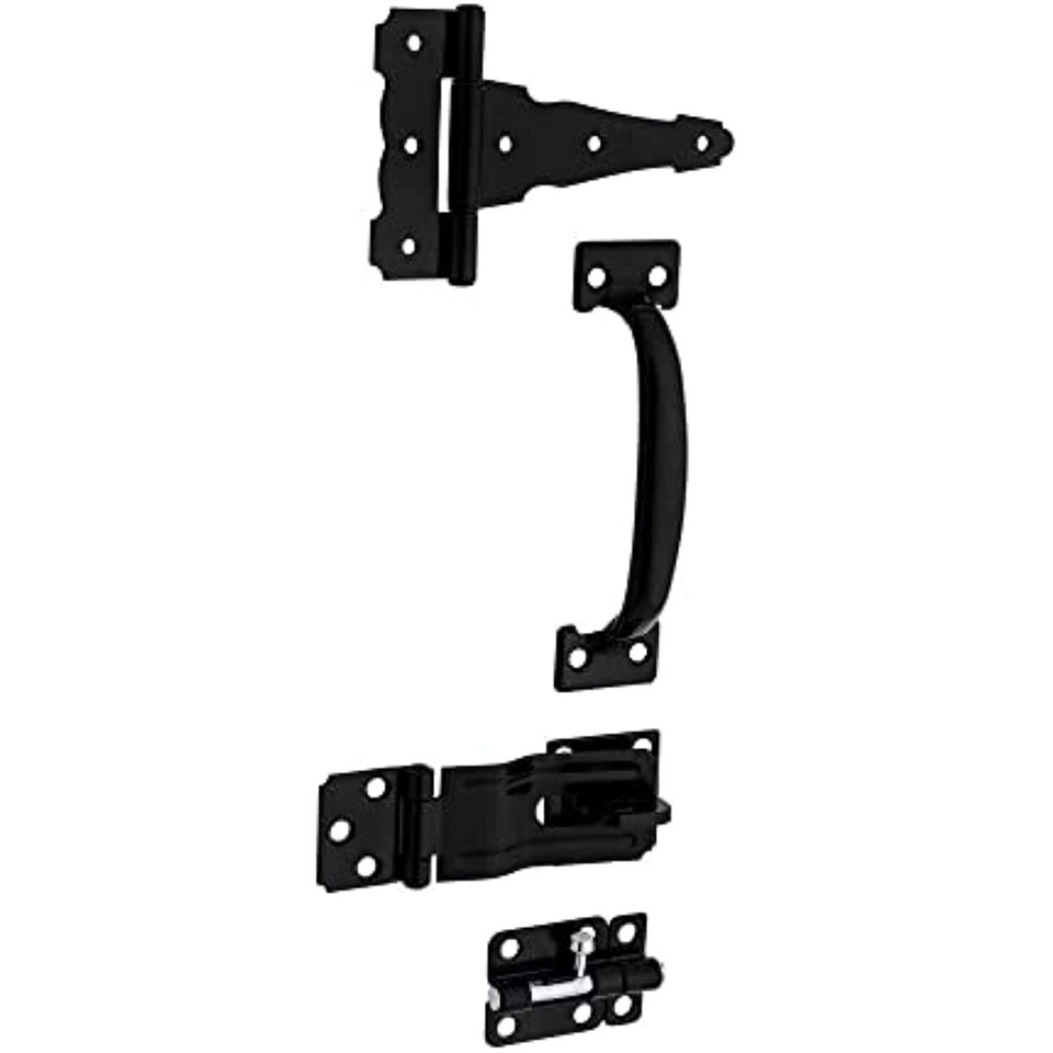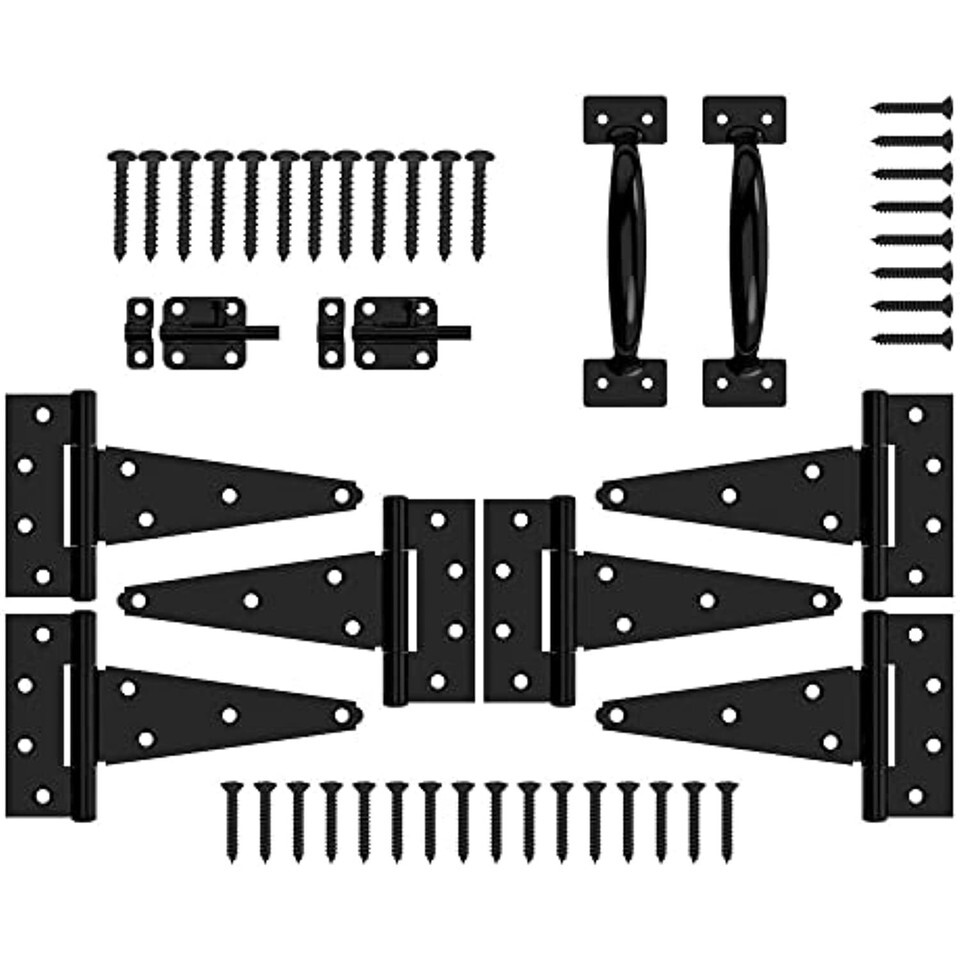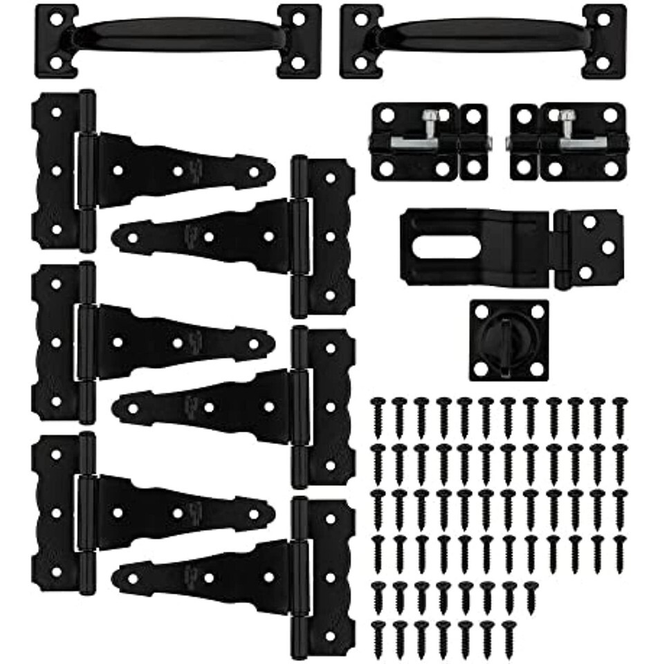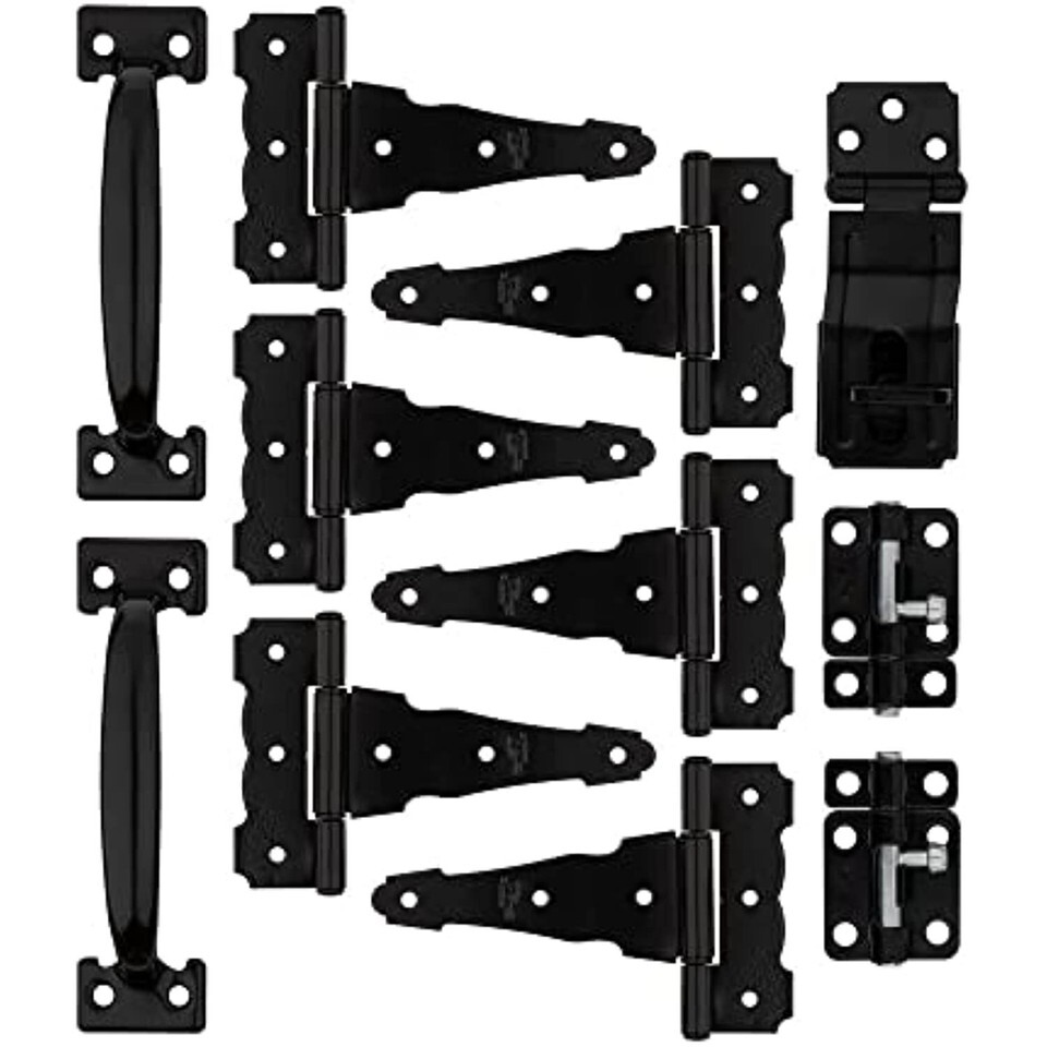 Kit includes (6) T-hinges, (2) Barrel Bolts, (2) Pulls and (1) Swivel Staple Safety Hasp.