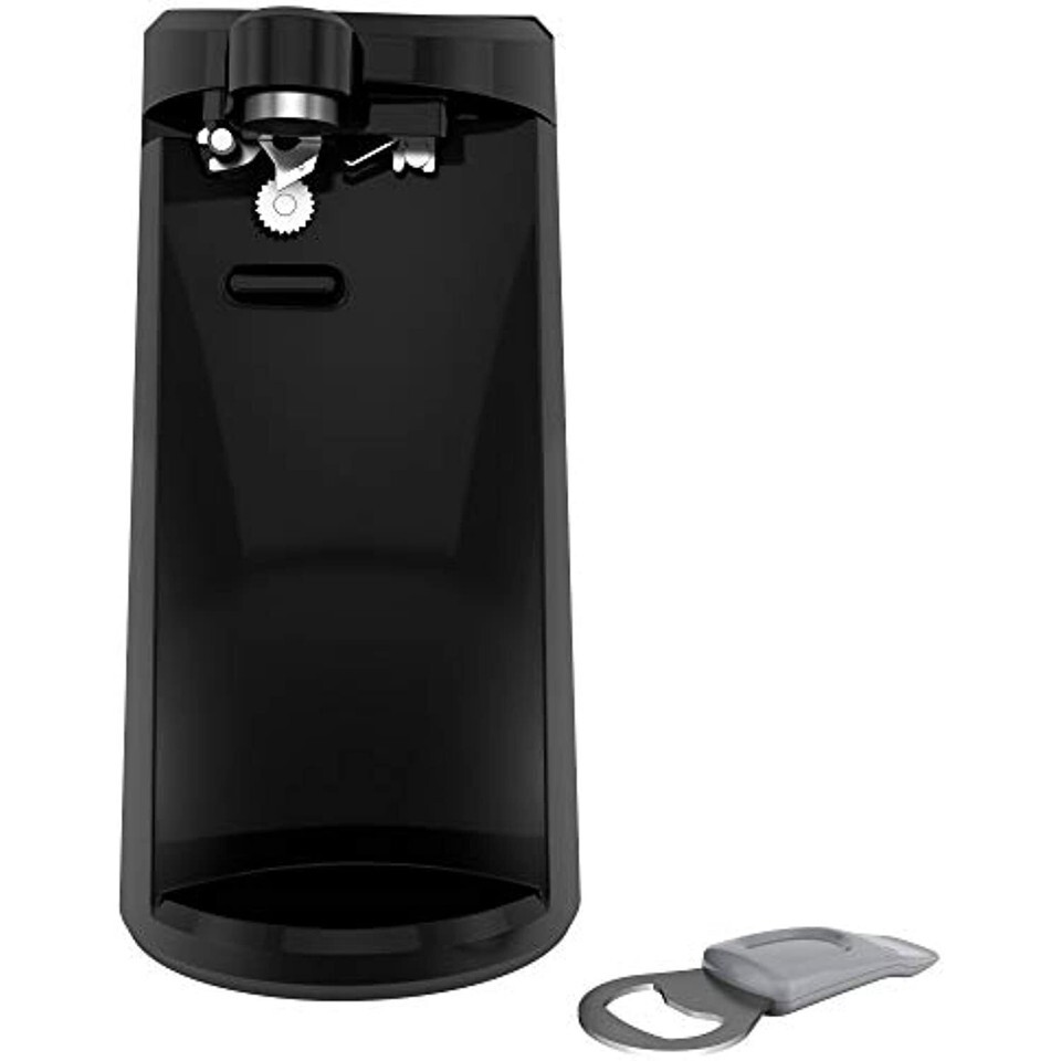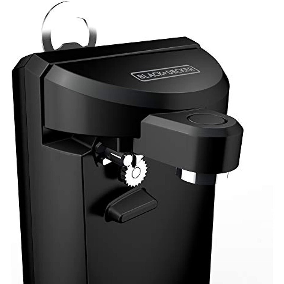 Simplify everyday kitchen tasks with the BLACK+DECKER EasyCut Extra-Tall Can Opener The tall wide design accommodates most can sizes and the EasyCut Blade Technology easily pierces cans for fast lid removal The unit includes a built-in knife sharpener and a multi-tool that removes bottle caps and pop-tops In one compact device you get can opener knife sharpener bottle opener and pop-top remover