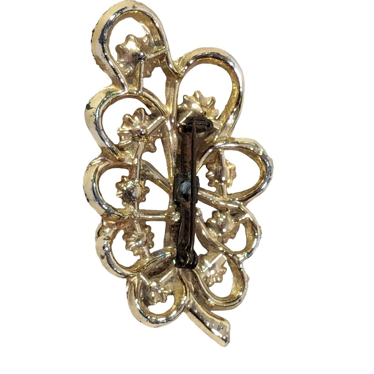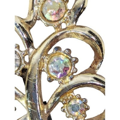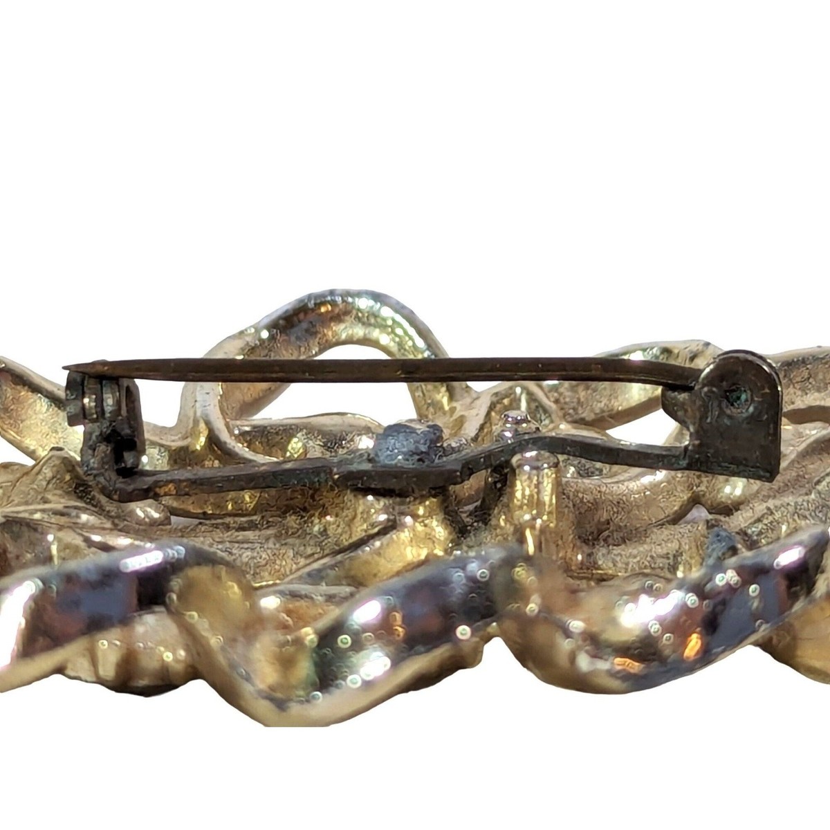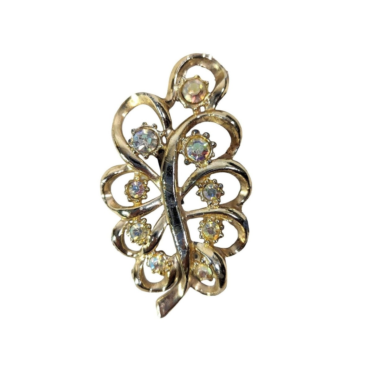 Vintage 1960s Gold Tone Swirl Leaf Brooch Pin Clear Rhinestones 2" x 1.5" Gift