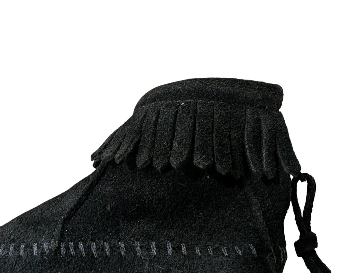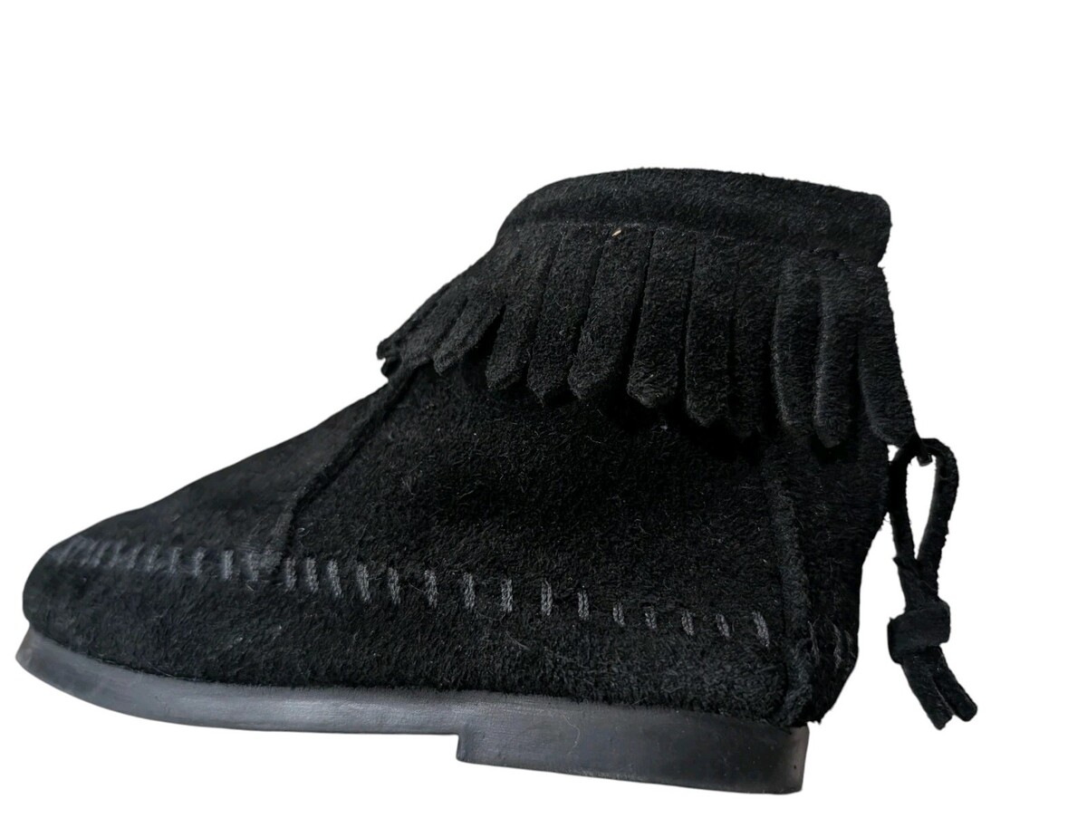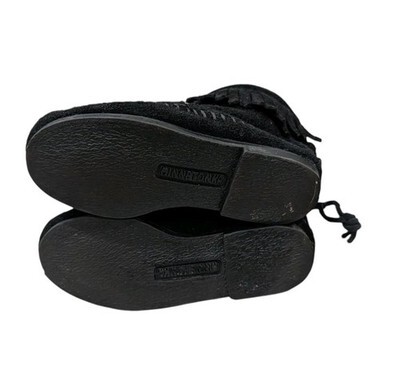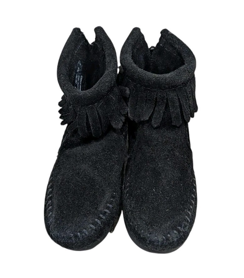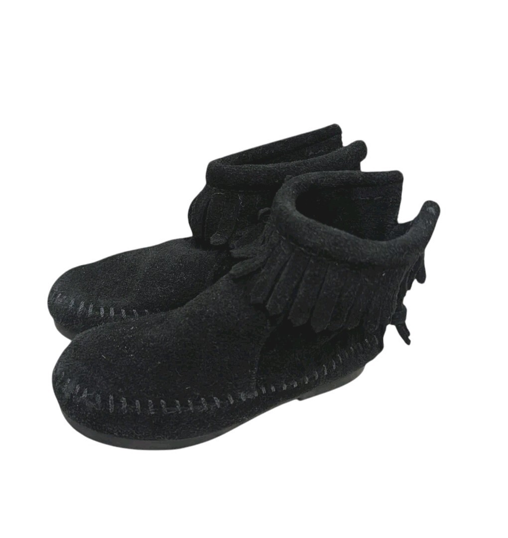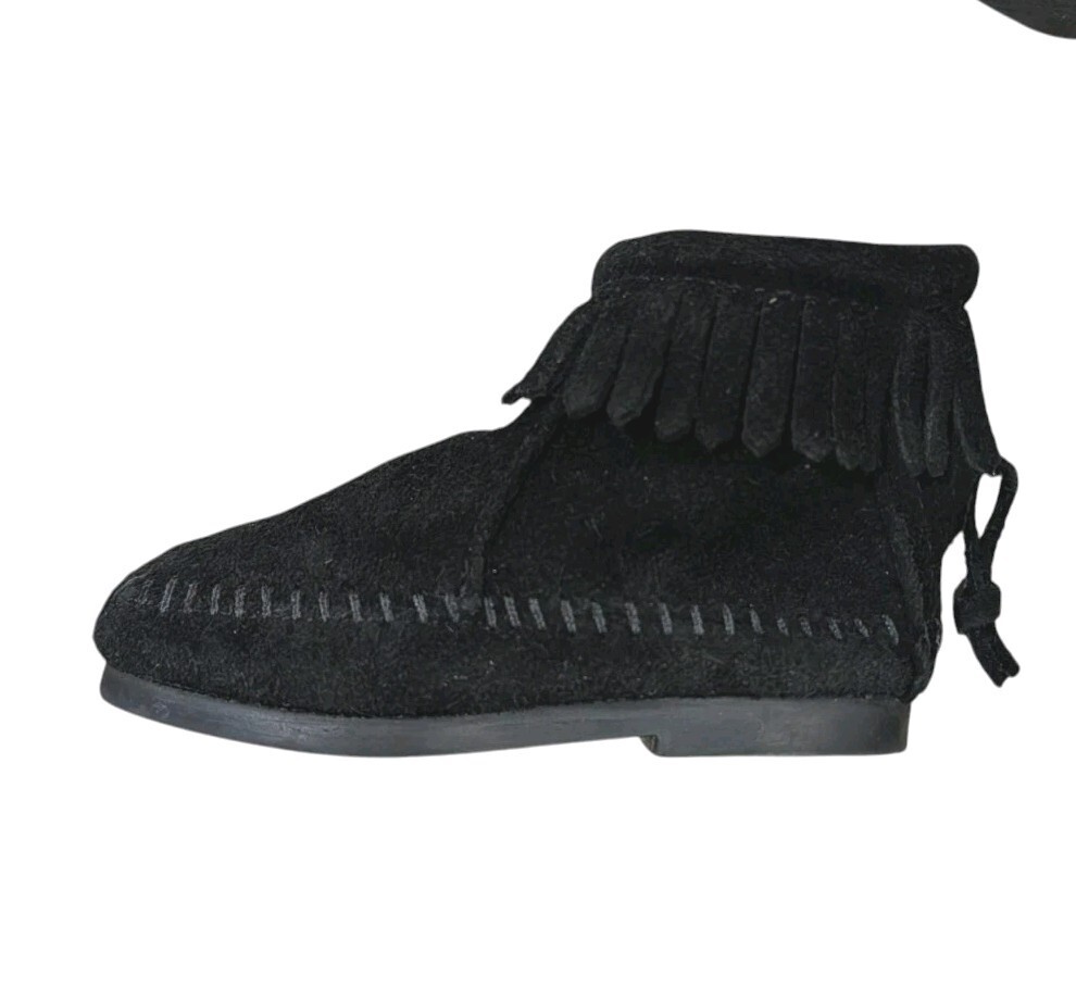 These are adorable toddler girls Minnetonka black suede leather ankle boots. Fringe around the ankle. Zips up the back. They are new without the box