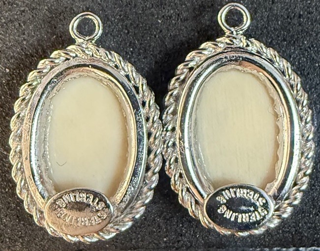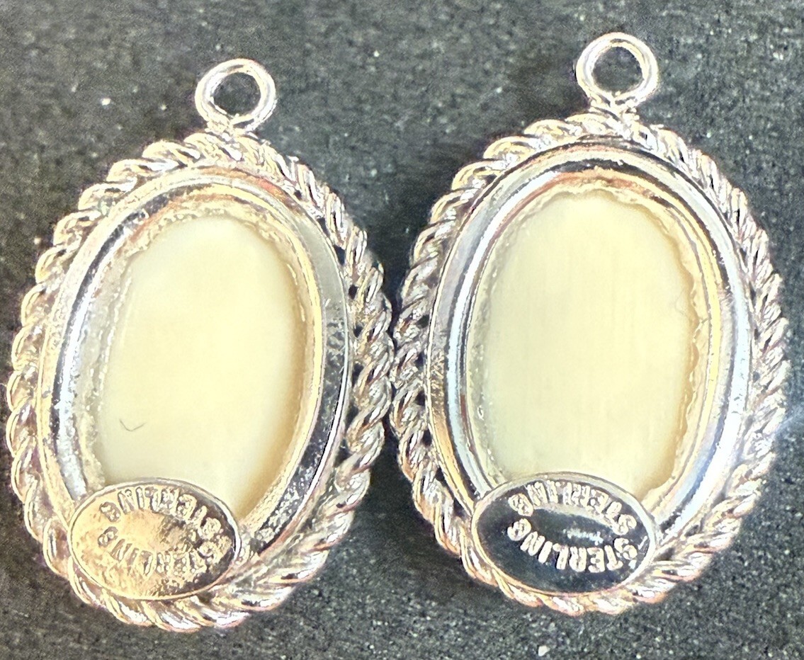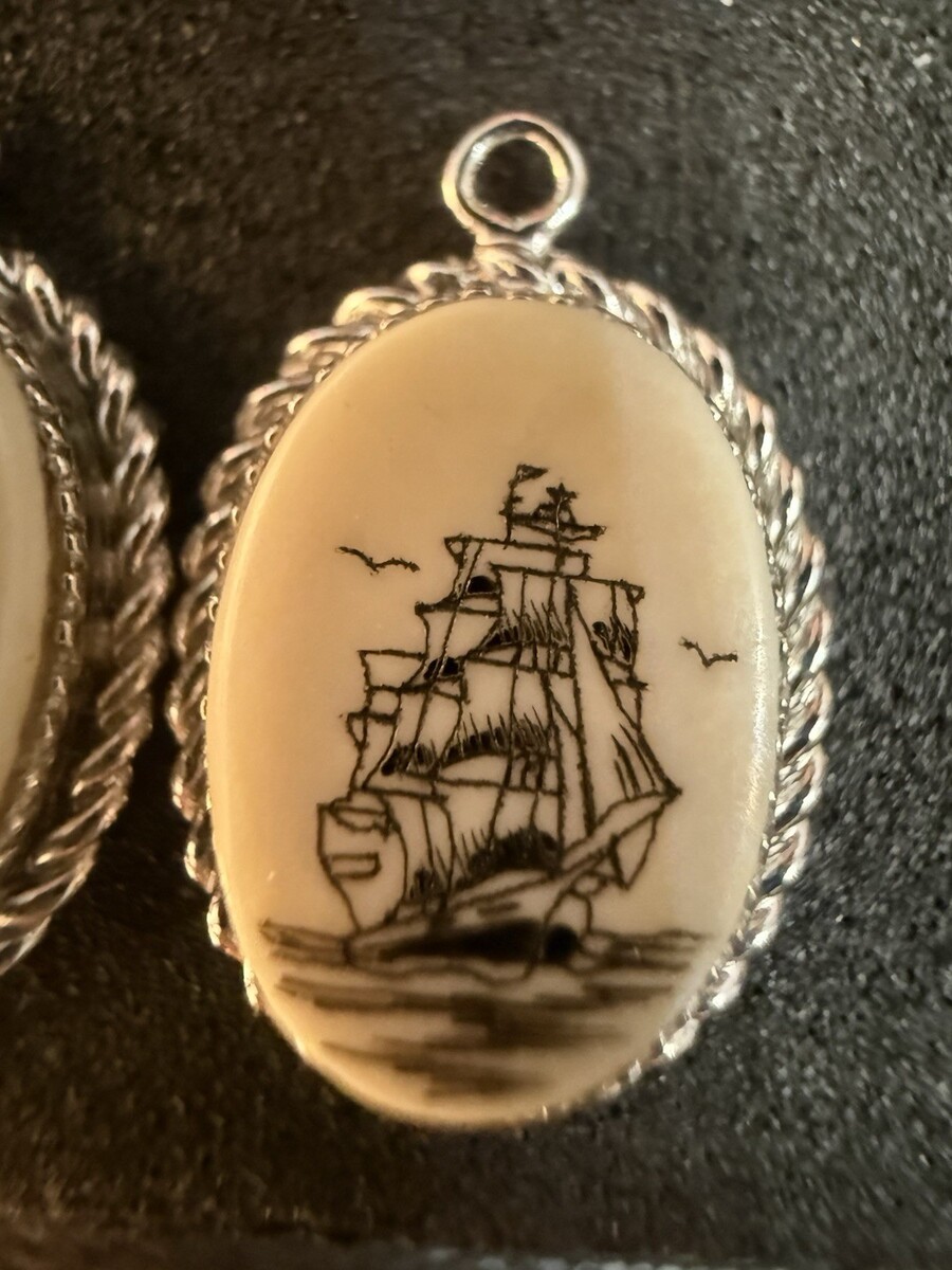 This is a stunning pair of sterling silver pendants featuring an oval-shaped faux scrimshaw ship design in cream color. The vintage pieces have an excellent cut grade and a classic pendant style, perfect for adding a touch of elegance to any outfit. The intricate designs and high-quality materials make these pendants a unique and valuable addition to any jewelry collection.