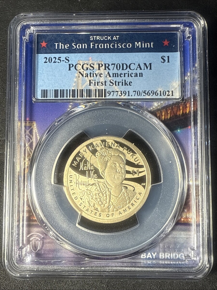 The product is a 2025-S Sacagawea Native American Dollar graded as PR70 DCAM by PCGS. This coin is uncirculated, composed of brass, struck in proof, minted in S location, and features the Sacagawea design. It is a special variety with certification from PCGS, originating from the United States. Perfect for collectors of US coins, especially those interested in Native American-themed denominations.