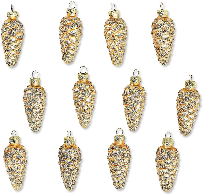 Holiday Glass Pine Cone Ornaments - Set of 12, Sparkling Mini Tree Decorations,