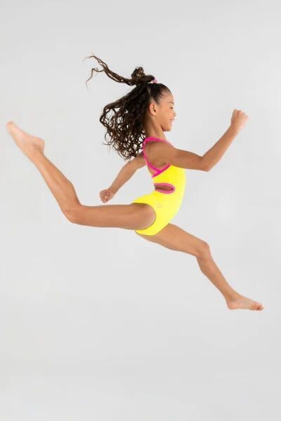 This eye-catching leotard tells a story of grace and strength. Its radiant yellow and pink design sparkles with rhinestones, while the strappy back adds flair.