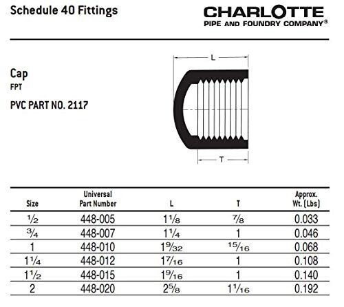 This Charlotte Pipe PVC cap is a high-quality product designed to provide a secure closure for your pipe. The cap is made of durable PVC material and is compatible with Schedule 40 pipes. It has a nominal pipe size of 2-1/2'' and a weight of 0.400 lbs. The cap comes in a pack of two and has a model number of PVC 02117 2000.