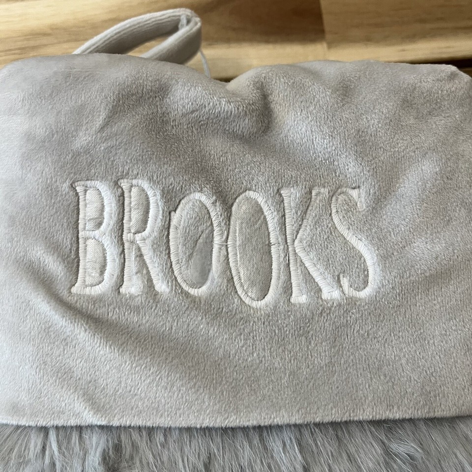 This fully lined stocking is very plush and is monogrammed with the name Brooks. The name is not quite evens (see picture), but it probably would not be noticeable when hung. Absolutely a beautiful stocking!