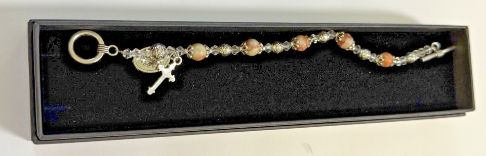 You are purchasing a very nice light brown/beige bead bracelet with a medal of Our Lady of the Miraculous Medal charm a Crucifix.