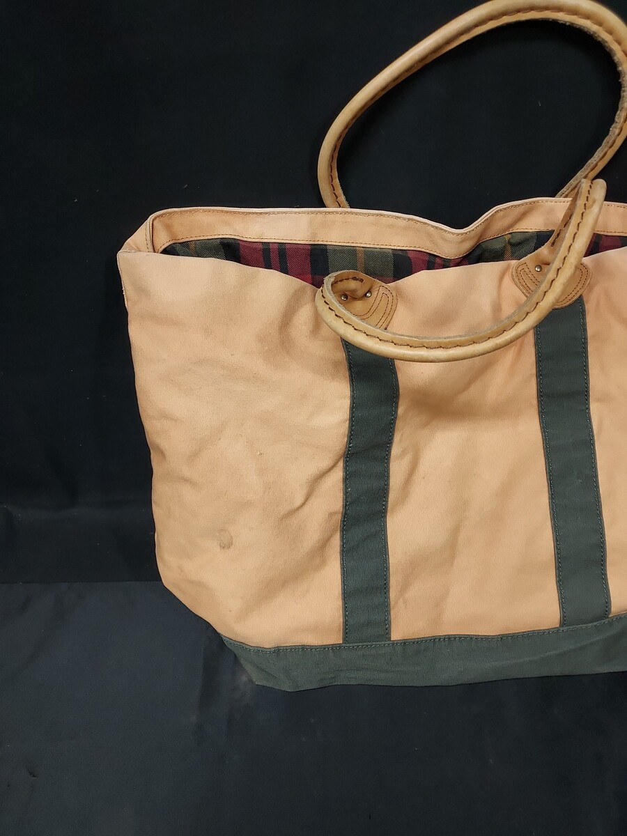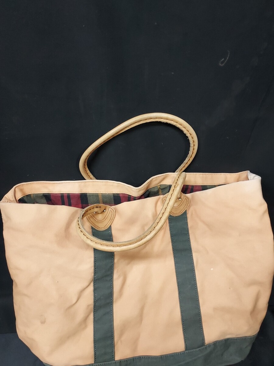 LL Bean Canvas Khaki Green Leather Handles Boat Tote Plaid Flannel Lined Tan Bag