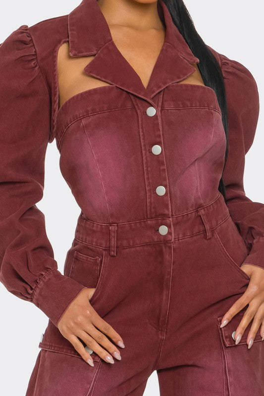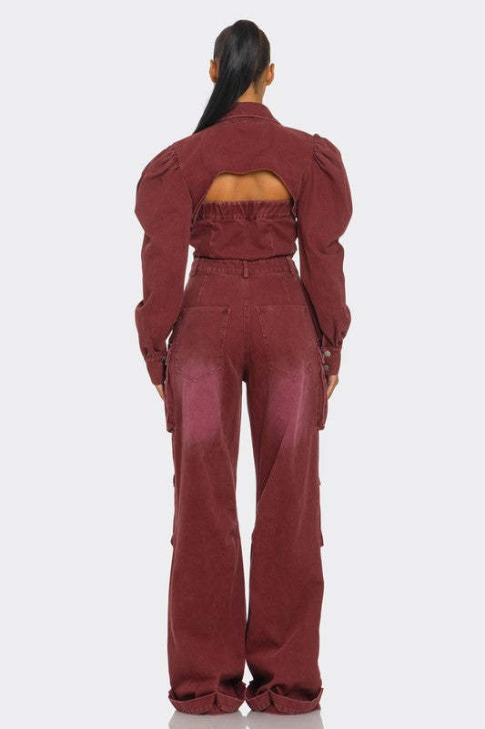 This vintage-inspired utility jumpsuit in rich burgundy combines classic workwear elements with a modern twist. The puffed shoulders, cut-out details, and wide-leg cargo pants create a striking silhouette. Ideal for those who want to combine rugged utility with feminine flair.