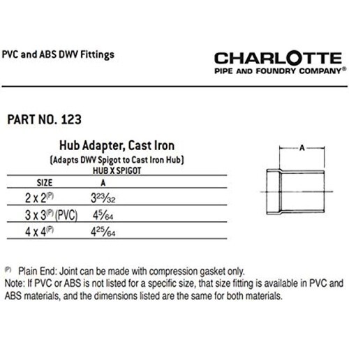 CHARLOTTE PIPE 3 x 3 DWV HUB Adapter CAST Iron HUBXSPG DWV (Drain, Waste and