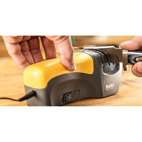 Product Description Smith's, the leader in innovative sharpening technology, is proud to offer an electric knife sharpener that incorporates both manual and mechanical sharpening elements. This unique combination provides a broad capability to easily sharpen dull blades and maintain razor sharp edges. The sharpening wheels on your Edge Pro Compact Electric Knife Sharpener are made from bonded synthetics. The synthetics used are selected for their ability to guarantee longer wheel life, uniform cutting, and minimum heat build up, so that de-tempering of your blade does not occur. Our wheels are manufactured according to strict tolerances in order to ensure the same high quality on each and every wheel that we make. The crossed ceramic rods put the final finished edge on your blade. Crossed ceramic rods create a fixed sharpening angle that lightly hones both sides of your blade at the same time; thus, putting a polished, razor-sharp cutting edge on your knife. Also, the crossed ceramic rods are excellent for giving already sharp knives a a quick touch-up before use. From the Manufacturer Smith?s, the leader in innovative sharpening technology, is proud to offer an electric knife sharpener that incorporates both manual and mechanical sharpening elements. This unique combination provides a broad capability to easily sharpen dull blades and maintain razor sharp edges. The sharpening wheels on your Smith?s Electric/Manual Knife Sharpener are made from bonded synthetics. The synthetics used are selected for their ability to guarantee longer wheel life, uniform cutting, and minimum heat build up, so that de-tempering of your blade does not occur. Our wheels are manufactured according to strict tolerances in order to ensure the same high quality on each and every wheel that we make. The crossed ceramic rods put the final finished edge on your blade. Crossed ceramic rods create a pre-set sharpening angle that lightly hones both sides of your blade at the same time; thus, putting a polished, razor-sharp edge on your knife. Also, use the crossed ceramic rods for a quick touch-up of already sharp knives. Just a few, quick pulls through the sharpening slot is all it takes. Smith?s recommends always using the ceramic rods for final edge honing after you sharpen using the synthetic wheels. Again, just a few pulls through the sharpening slot is all it takes.