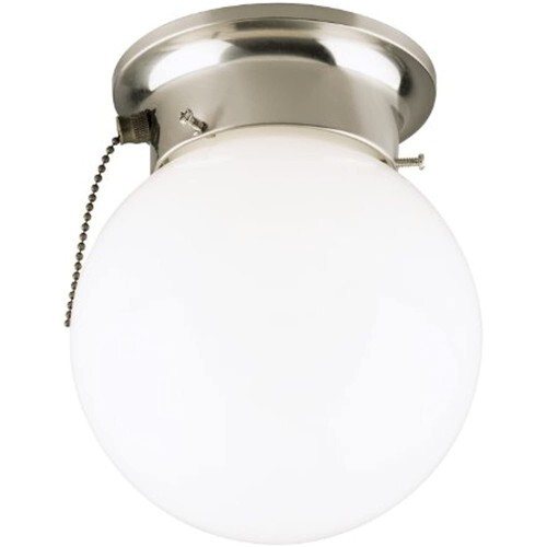 With a simple white glass globe, this Westinghouse One-Light Flush-Mount Interior Ceiling Fixture offers ample light and a pleasing look. The understated style of the brushed nickel finish will complement any surrounding, while the white glass globe provides even illumination. The fixture has a flush-mount design that makes suited to low- and high-ceilinged rooms alike. Perfect for closets and other areas without a light switch, the fixture includes a pull chain for easy operation. The light fixture is 7-1/4 Inch high by 6 Inch in diameter. It uses one medium-base light bulb, 60-watt maximum (not included). The fixture's compact design makes it ideal for smaller spaces. This Westinghouse interior light fixture is Underwriters Laboratories listed for safety. It is backed by a five-year manufacturer's warranty against defects in materials and workmanship.