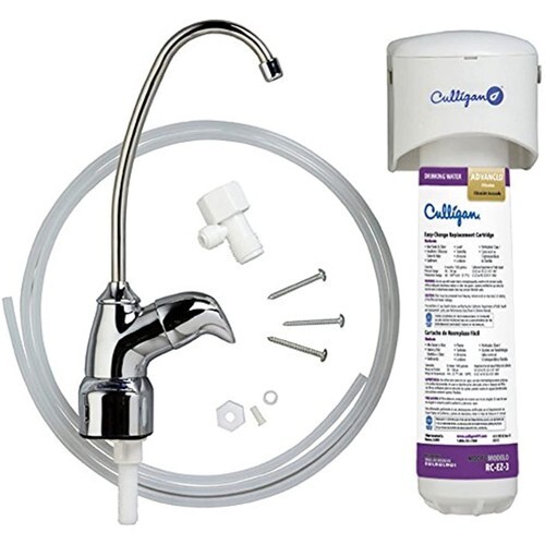 Product Description Advanced EZ Change system provides clear, clean, great-tasting water for drinking and cooking to a dedicated faucet. The included RC-EZ-3 Advanced filtration cartridge can filter 500 gallons and last up to 6 months. Avoid the mess of changing traditional cartridges and eliminates the need for buckets, towels, wrenches, and other tools. Tubing and installation hardware is included. A built-in LED filter life indicator takes the guess work out of when to change your filters. From the Manufacturer The Culligan under sink drinking water system includes filter head with built In bracket, RC-EZ-3 cartridge, mounting screws, supply adapter, lead free faucet with built in electronic cartridge life indicator and 1/4-inch plastic tubing, 6 months/500 gallons filter life. The filter features a twist on, twist off mechanism, quick connect fittings, double water shut off. The filter reduces bad taste and odor, chlorine taste and odor, sediment, lead, cysts such as cryptosporidium giardia, turbidity, atrazine, lindane. The filter is NSF certified and has a 5-year warranty.