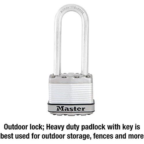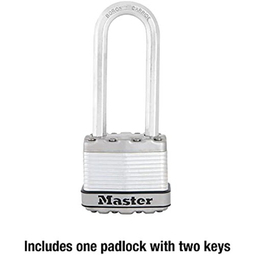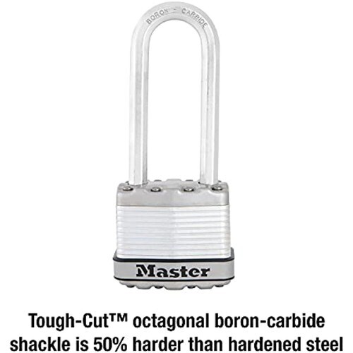 The Master Lock Magnum M1XDLJ Laminated Padlock with Key features a 1-3/4 in. (44 mm) wide laminated steel body for maximum strength and reliability, and is surrounded by stainless steel and zinc outer components for weather resistance. The 5/16 in. (8 mm) diameter octagonal shackle is 2-1/2 in. (64 mm) long and made of Tough-Cut boron-carbide, 50% harder than hardened steel, offering maximum resistance to cutting and sawing. The 4-pin cylinder prevents picking and the dual locking ball bearings provide maximum resistance against prying and hammering. The Lifetime Guarantee provides peace of mind from a brand you know and can trust.