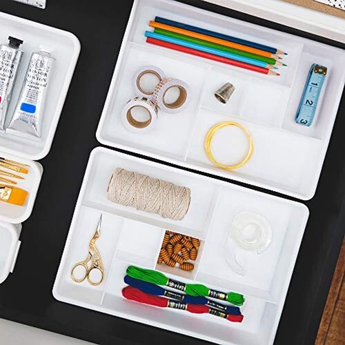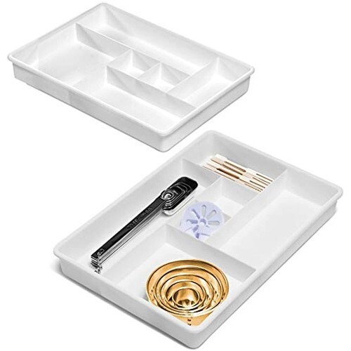 Inspired by the madesmart original junk drawer organizer, The madesmart two-piece drawer organizer offers a smaller solution for your messy drawers. The two trays act as a system to organize even the smallest items in your drawers. Each organizer has 6 Various sized compartments and fit in smaller drawers. Made of high-quality, durable plastic for long-lasting organization.