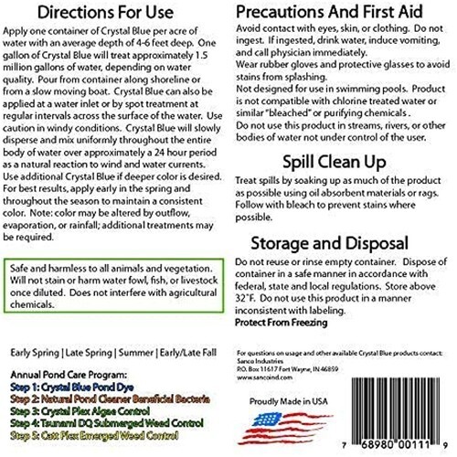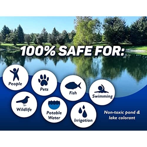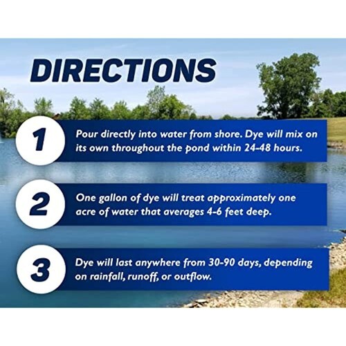 Enhances the color of your pond or lake all year long. 100% safe for fish, livestock, swimming, and waterfowl with no irrigation or consumption restrictions. Apply by simply pouring into your pond at several places. 1 gallon treats 1 acre pond 4' to 6' deep.