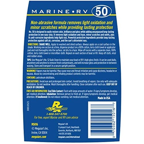 Meguiar's M50 Marine/RV Liquid Cleaner Wax is a non-abrasive formula that cleans, polishes and protects all fiberglass gel coat marine and RV surfaces in one easy step. This convenient one step emoves light oxidation, haze, minor scratches and swirls, while providing long-lasting protection against salt air, corrosion and the sun's ultraviolet rays. Versatile formula is safe and effective by hand, DA Polisher, or Rotary Buffer.