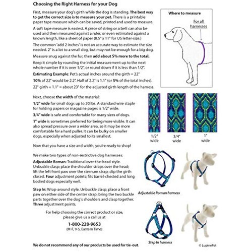 Lupine products are proudly built in Conway, New Hampshire and Guaranteed (Even if Chewed). They are not chew-proof (no fabric is!) but if they get chewed, LupinePet will replace them. Search on 'Lupine Guarantee' to see how EZ it is!Lupine High Lights are available in 6 bright colors and three widths: 1/2", 3/4" and 1". High Lights are made from nylon with reflective threads woven into the front, back and edges for maximum visibility. The reflective threads bounce light back to an observer so that these products may be seen in low-light or dark conditions when light shines on them. Made with strong bar-tack stitching, welded steel hardware, and ends which are turned under and stitched to protect fur and skin. Matching leashes and collars are available.The 1-inch-wide Lupine Adjustable Step In harness is offered in two adjustable girth sizes: 19 to 28-inches and 24 to 38-inches. To choose the correct size always measure the dog around the body, just behind the front legs. Measure snugly, and then add an extra 5% to find the actual adjusted size of the harness girth. Or, measure the girth strap from the dog's current harness.This harness goes on from the feet up. Start by unclipping the buckle, then place each front paw on either side of the center strap. Then bring the two ends up and over the dog's back and clip the buckle closed. Adjust the three straps as needed.Machine or hand-wash, warm water and mild soap (no bleach or bleach alternative). Air dry completely before use.The harness should be removed from the dog when the leash comes off and it should not be left on an unattended dog. Lupine products are not intended for tie-out.