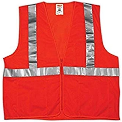 Class 2 high visibility safety vest. Lightweight, affordable, features breathable polyester material and 2 inch silver reflective tape.