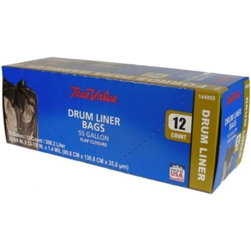 True Value, 12 Count, 55 Gallon, 1.4 Mil, Black, Drum Liner Trash Bag, Wing Tie, 36" x 54",Boxed.