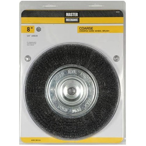 Master Mechanic, 8", crimped coarse wire wheel brush, use on 8" bench pedestal grinders for removing paint, rust, dirt other surface contaminants on metal Parts, clean threads, garden tools other various small Parts that can be transported to the tool, 5/8" arbor, 4,500 max RPM, 012 gauge wire, Clamshell.