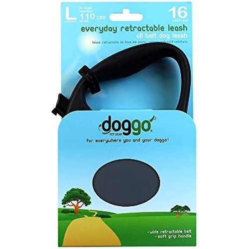 The doggo Everyday Retractable Leash is designed for everywhere you and your dog go. Use this leash when you want to give your pet the freedom to roam, sniff and explore during your walks together. It features a comfortable soft grip handle and an all belt design (no cords.). It is available in three sizes: Small (13 ft. long for dogs that weigh up to 45 lbs.), Medium (16 ft. long for dogs that weigh up to 65 lbs.) and Large (16 ft. long for dogs that weigh up to 110 lbs.). Matching Doggo nylon collars and leashes are also available.