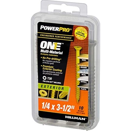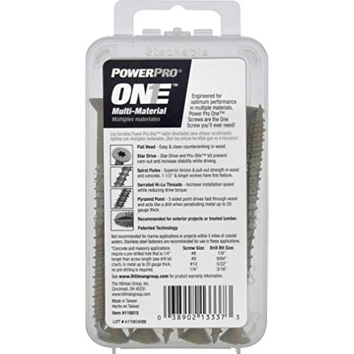 Engineered for optimum performance in multiple materials, Power Pro ONE screws are the ONE screw you'll ever need. Developed to outperform and replace standard wood, sheet metal, and concrete/masonry screws, the One Screw program simplifies your tool box by using a single, innovative, engineered screw design to satisfy projects that fasten into wood, metal, concrete, drywall, and plastic. The bronze epoxy coating is recommended for exterior projects and treated lumber (Not recommended for marine applications or projects within 5 miles of coastal waters). The flat head design and star drive provide easy and clean countersinking into wood. Manufactured with spiral flutes, serrated hi-lo threads, and a 3-sided pyramid point, no pre-drilling is required in wood, drywall, plastic, or metal up to 20 gauge thick. Concrete and masonry applications require a pre-drilled a hole, see product packaging for pre-drilling instructions. Each package includes a free durable Pro-Stik Star Driver Bit. All ONE Screw products offer a limited lifetime.