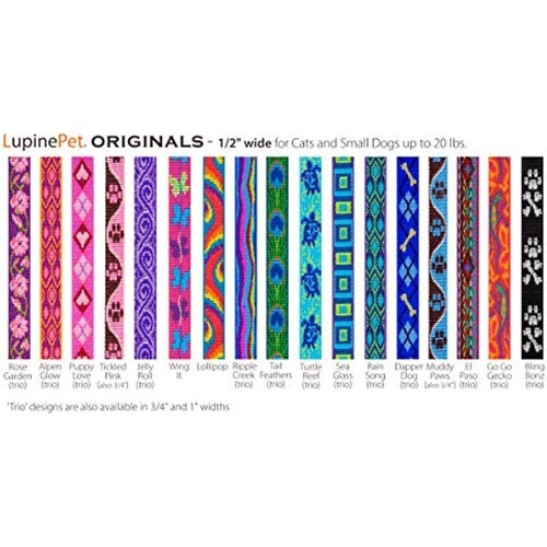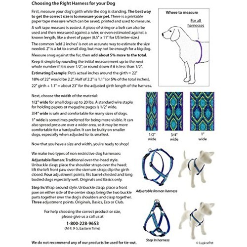 Lupine products are proudly built in Conway, New Hampshire and Guaranteed (Even if Chewed). They are not chew-proof (no fabric is!) but if they get chewed, LupinePet will replace them. Search on OLupine GuaranteeO to see how EZ it is!The Lupine Adjustable Step In harness is sized by the inches-around the dog's ribcage. To choose the correct size always measure around the body, just behind the front legs. Measure snugly, and then add an extra 5% to find the actual adjusted size of the harness girth. Or, measure the length of the girth strap from the dogOs current harness.This harness goes on from the feet up. Start by unbuckling the clip, then place each front paw on either side of the center strap. Then bring the two parts up and over the dogOs back and clip the girth strap closed. Adjust the three straps as needed. The harness should be removed from the dog when the leash comes off and it should not be left on an unattended dog. Lupine Originals are made from woven nylon in an array of colorful designs. The pattern is woven into the webbing, rather than printed or sewn on. Made with strong bar-tack stitching, welded steel hardware, and ends are turned under and stitched to protect fur and skin. Matching collars and padded handle leashes are available. Machine or hand-wash, warm water and mild soap (no bleach or bleach alternative). Air dry completely before use. Lupine products are not intended for tie-out.