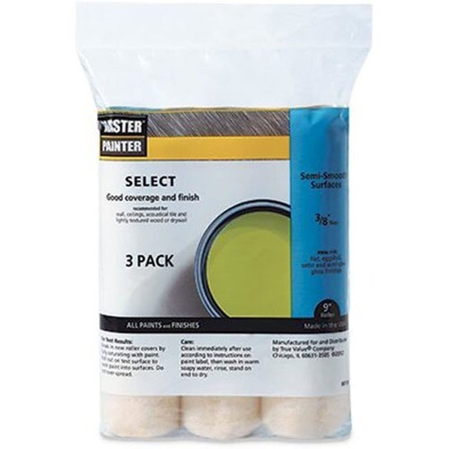 Product Description Master painter select, 3 pack, 3/8 inch nap, roller cover, for all paints stains on semi smooth surfaces. From the Manufacturer True Value Master Painter Select 9-Inch Paint Roller Covers for Semi-Smooth Surfaces are shed-resistant, perfect for all paints and finishes and recommended for walls, ceilings, acoustic tile and lightly textured wood or drywall. They are ideal for applying flat, eggshell, satin, semi-gloss or gloss finishes. 9 inches long with a 3/8-inch nap. 3-Pack.