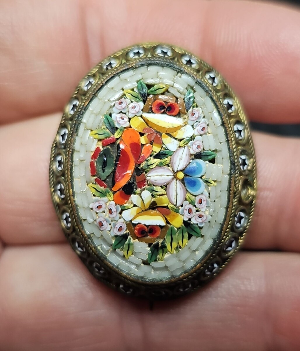 The pin shows normal age-related wear. One tiny mosaic inset is missing (shown in photos), and the clasp will need repair if you want to wear it. It still displays beautifully and is a wonderful piece for collectors of micro mosaic jewelry, vintage Italian artisan work, or floral brooches.