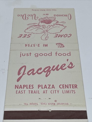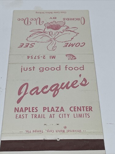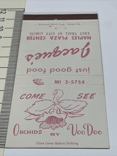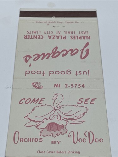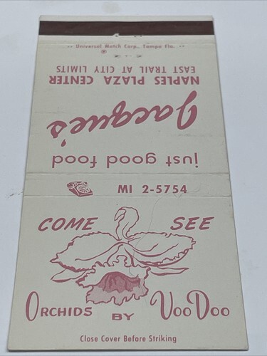 Matchbook Cover COME SEE Orchids By VooDoo Jacgue’s just good food Naples gmg