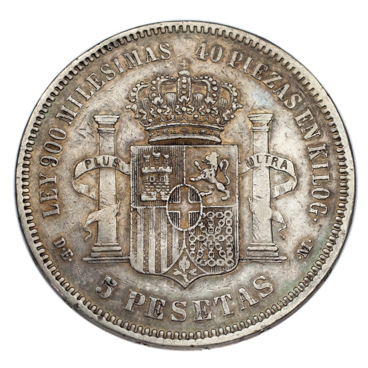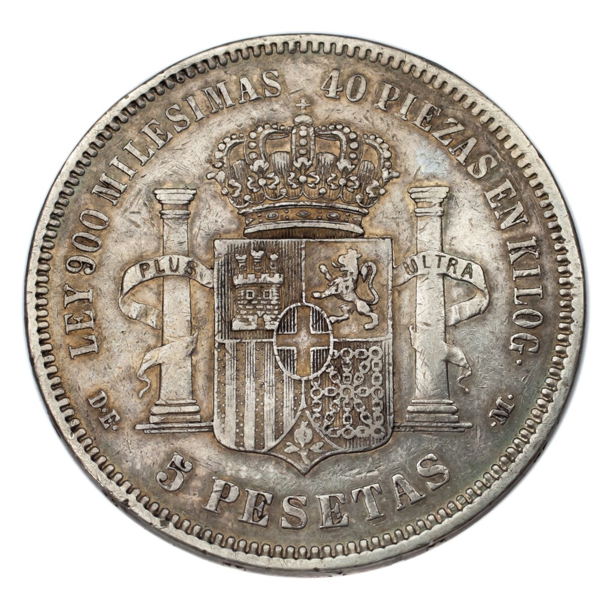 1871 (74) DR-M Spain 5 Pesetas Silver Coin in XF, KM# 666 1883 Spain 5 Pesetas Coin Obverse features Amadeao I head to the left Reverse features crowned arms, pillars, value below Mintage: 5,075,000 Struck from Silver, 0.900 Fineness Condition: Ungraded, Expected to grade as Extra Fine (XF) Catalog number: KM# 666 *Condition descriptions are approximate. Please see photos for the actual item you are bidding on. Visit Our Store: Continental Coin and Jewelry California Buyers: 9% sales tax will be added. We offer a 30 day money back return policy. If you are unhappy with your purchase for any reason, please notify us so that we can begin the returns process. Thank you. Continental Coin and Jewelry Company Web Department: Monday ? Friday, from 10:30am ? 6:00pm PST Reference It