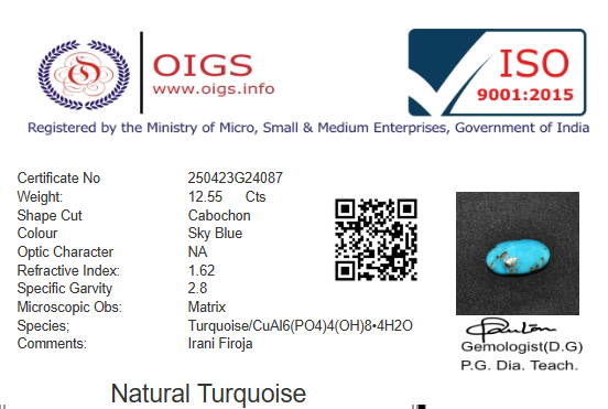 Turquoise / Firoza - 12.55 Carats - Lab Certified
