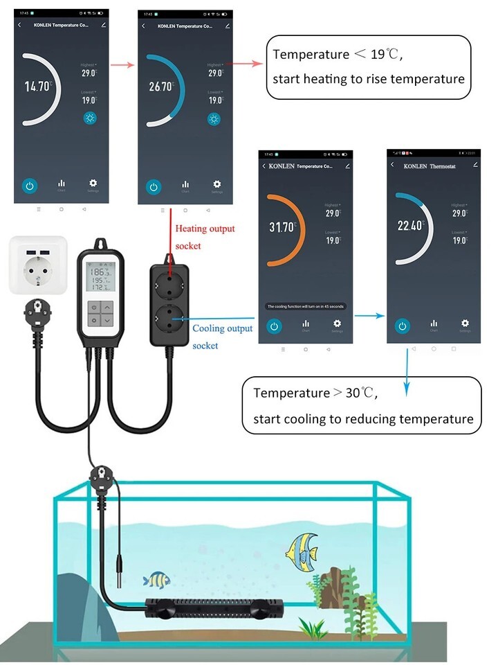 Example: The most suitable temperature environment for ornamental fish is about 19? to 29?. Set the highest temperature is 29?, the lowest temperature is 19?. It will auto-start the heating output socket to increase the temperature when the current temperature is lower than 19?. If the temperature is higher then 29?, it will auto stop the heating, then switch to auto start cooling output socket to reduce the temperature.