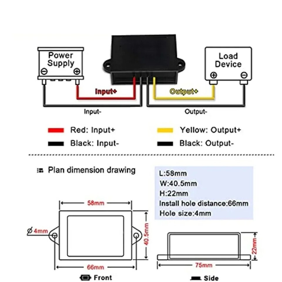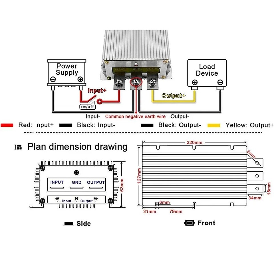 Attention: Pls install according to the the label strictly,positive pole and nagative pole can't be reversed, or the module and device might be damaged To assure this converter has the sufficient voltage and power pls make sure the voltage and power input is enough. This converter can't be used to charge battery, if you need please order our battery charger converter.