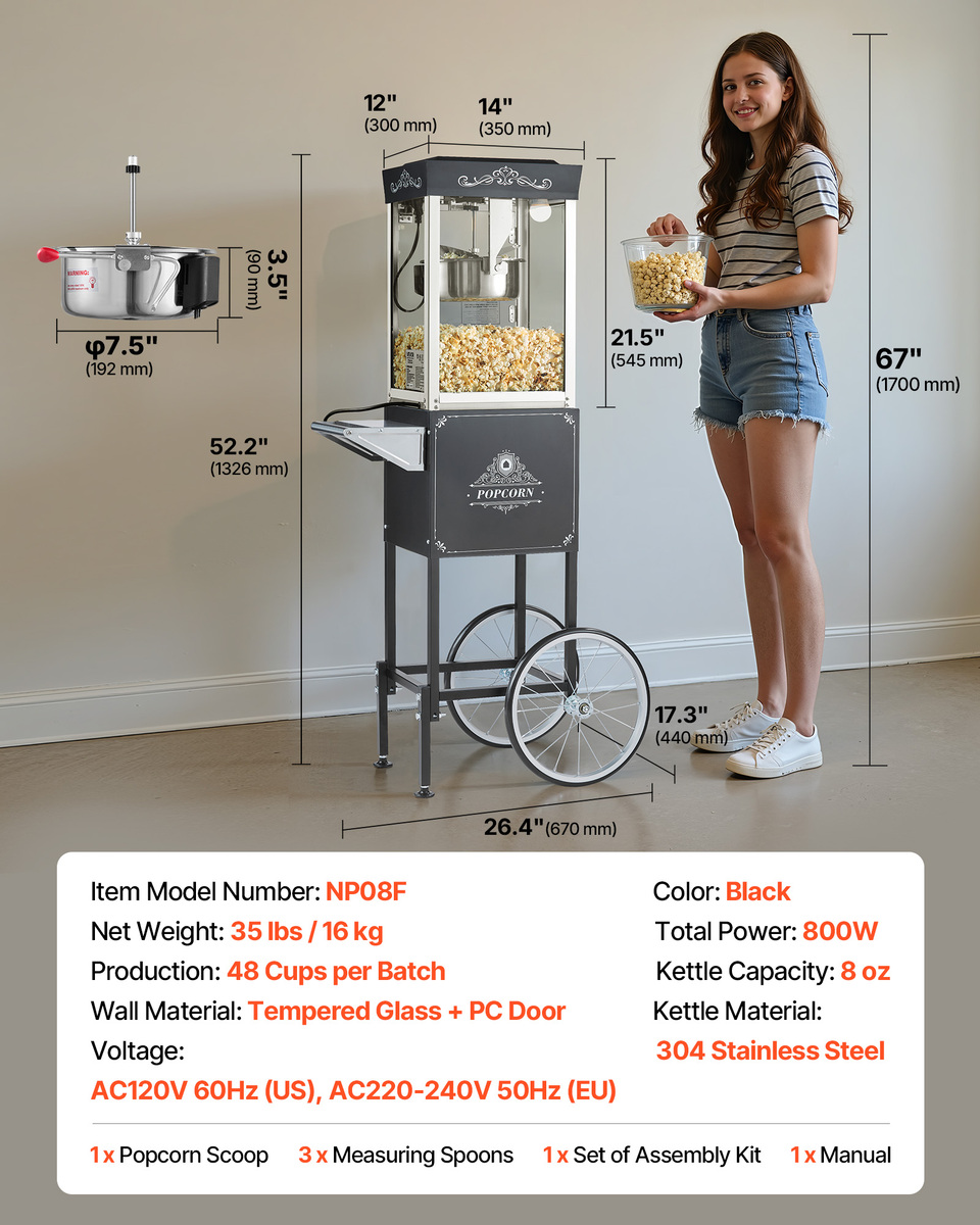 VEVOR Popcorn Machine with Cart, 8oz Kettle 800W Commercial Popcorn Maker, Black