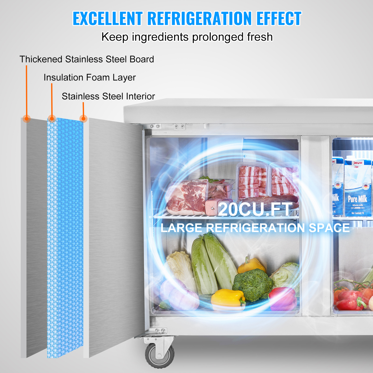 20 Cu.Ft Capacity: This large-capacity refrigerated prep table features a digital control screen to maintain internal temperatures between 33-41F / 2-8C. Adjustable shelves allow for dual-zone storage, and internal lighting makes it easier to access and organize items.